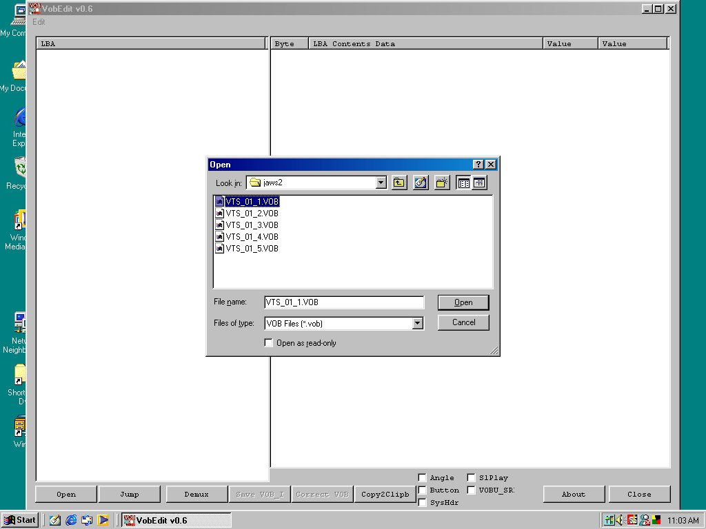 This is easily done with Vobedit 0.6, open the folder 'jaws2' then select the 1st Vob file listed, the press the 'open button.