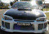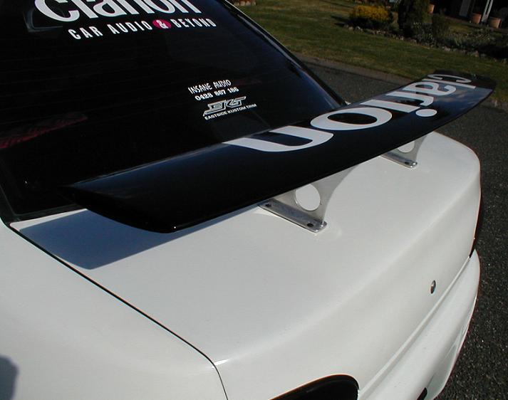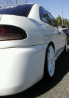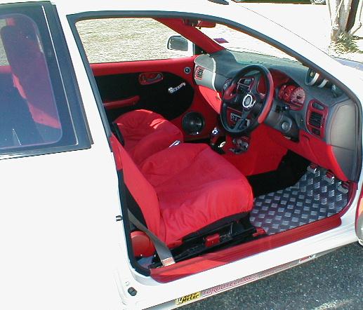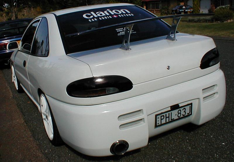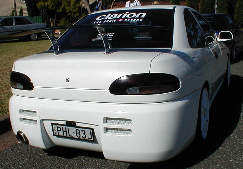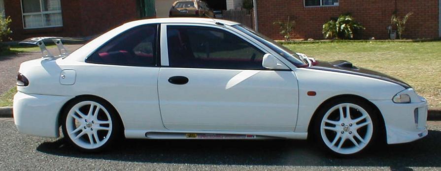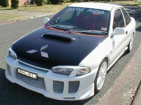 PHL-83J Phil has come a long way since first purchasing the white 1.5 GL coupe a couple of years ago. He's dumped the old carby engine in favour of the 1.8 EFI for now and concentrated on achieving his own street-racer look. The black and white colouring on the outside of the car is perfectly contrasted by the vibrant red velour interior. Other touches like the custom bonnet with Mitsubishi emblem cut out, the carbon fibre T-wing, big white wheels and extra low front and rear bars all piece together quite nicely. This car certainly turns heads wherever it goes. Well done Phil for achieving your own individual look - It looks great!