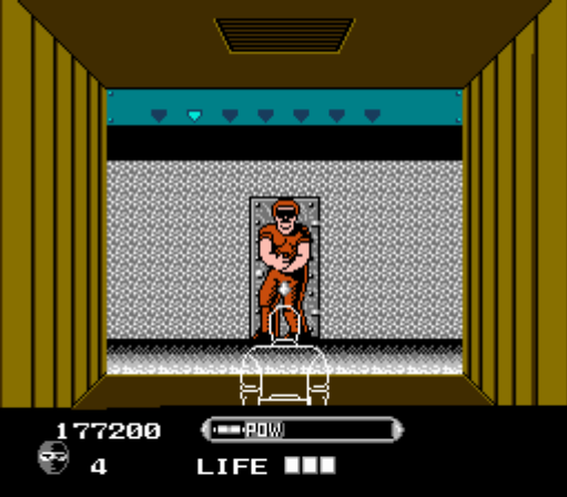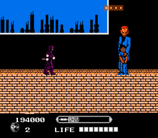 Enemies:Aside from the bosses, the only enemies are Blue Man, Red Man, Red Ninja, Green Ninja, and Army Man. The useful enemy is the Red Man, who when captured will give you information. Its kind of funny when you think about it, though, since with the exception of one member at the end of the game, not a single member knows anything about the organization they work for. This is a typical conversation between the Manta and his victim: