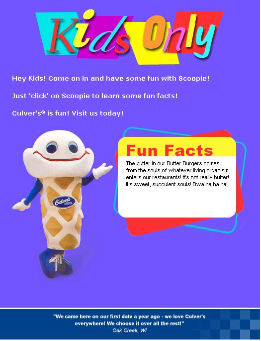 Willbo: I see. That was my next question, but oh well. According to the "Fun Scoopie Facts," Culver's steals people's souls who enter the establishment. How do you respond?