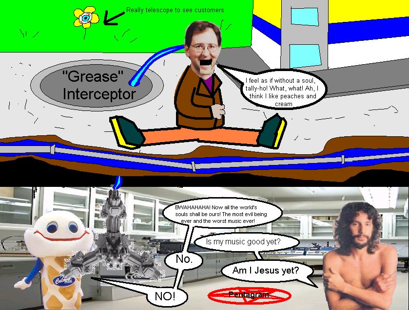 After the interview, I came to a conclusion that explained everything: Scoopie is actually Satan in a lousy costume who is cooperating with Cat Stevens to charge so much for their food because it is made of gold and souls. He uses the Soul Interceptor (labeled the Grease Interceptor” to ward off suspicion) because everyone walks by it, and thus looses their souls because it is sucked away. I have drawn a diagram to show this very well.