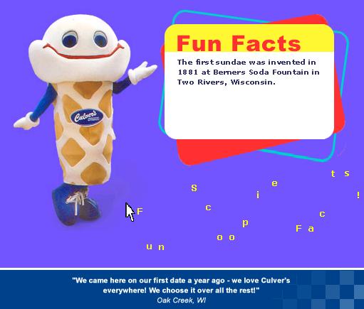 Shakes, malts and concretes! Thick and cremy…try one today! You know what else is thick and creamy? Think about it. Yes, that’s right, you got it. That stuff. Gross. Enough of that, the rest of the website was equally horrifying. While most of it was just poorly made and fake, two things disturbed me. First, the restaurant locator. This means there is more than one Culver’s. Jesus Christ. I don’t know of many things more disturbing than that. I mean, how much money are they making charging so much for their awful-waffle meals? The second, I’m afraid can’t be put into words.