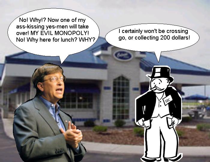 I thought long and hard (huh huh huh, hard) about Pennybags and Gates. Since Microsoft is evil, and are only sharing their software with Macintosh because the government made them but their deal with Dell is making it possible to bypass the regulations set by them by making “Dell” software, and Monopoly has pissed me off millions of times because I’m a poor loser and everyone in the Universe is a snobby faced bastard when they win, I didn’t really feel sorry for either of these guys. But I did think, ”Hm, Culver’s ‘Butter Burgers’ are made of gold, but that would only make them cost 49 dollars...where’s that extra 38 dollars coming from?” I think in Italics, by the way, that’s important. Well, I put my collected samples into my giant batman computer, and found out that all traces of human life had been sucked from them like a twelve-year-old hooker sucks at sucking dick. I decided upon three things, A) visit Culver’s website to gather data on the oddly K-Mart corporation, B) interview an actual employee of the Culver’s chain, and C) make random assumptions to fit whatever theory I jump to first, no matter how bizarre and nonsensical.