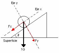 Desarrollo: Tomemos un cuerpo cualquiera. Definamos dos ejes (x,y) que están intrínsicamente ligados al cuerpo, pues se definen en función de él. La Fuerza Gravitacional, cualquiera sea la inclinación del mismo, ejercerá una aceleración de magnitud 1G (es decir, la fuerza que produce una aceleración de una gravedad) "hacia abajo".Sin embargo, la podemos descomponer vectorialmente en dos fuerzas linealmente independientes, una paralela al eje x y otra al eje y, que llamaremos Fx y Fy, respectivamente.