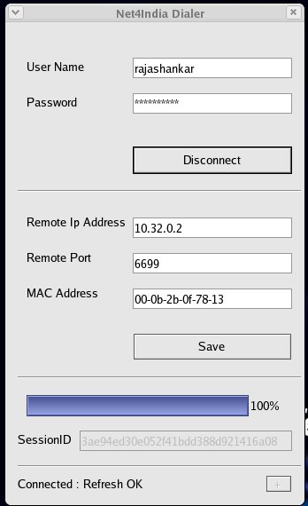 To use your net4india broad band connection you need its dialer , sadly the dialer is available only for windows . I have revese engineered the same and have the source copies .