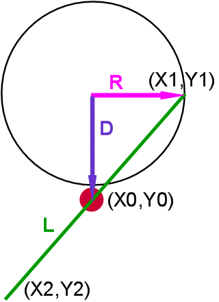 | X2 | =X1-L*COS(ATAN2((X1-X0),(Y1-Y0))) | |