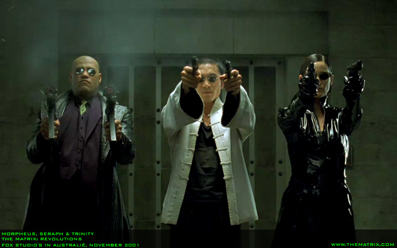 (left) Morpheus, Trinity and Sarrif are advancing through in the green light at the Merovingian's Party.
