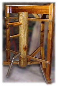| However, the more usual support for the dummy is a wall mounted frame, using either a wooden frame or motor car/bus/coach suspension springs. The dummy should be set up with the two upper arms at your own shoulder height, and the leg should touch the floor in order to teach how to step around obstacles and not lazily pass the feet under. Many practitioners make an inordinate fuss over the leg having to have a knee, but the bend at knee height is of more importance. One should note the height of the knee joint from one individual to another varies very little in comparison to the total height of the person, as height is primarily made up in the femur or thigh bone. |