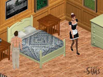 | "Hey honey... looks like you did a good job cleaning my room here. Let me give you an EXTRA tip. I've got it right here in my pocket. Come on over and I'll GIVE it to you anyway you like." "No, monsieur, I'm only here to clean. Not for the hanky-panky." |