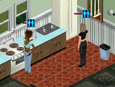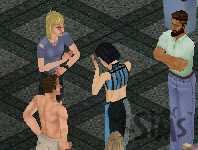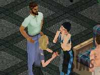 | Ah, company. Jolene came by to say hello to the new neighbor. Her son, Lawrence, came by to pout. He's not too thrilled that Dirk has moved out of Club Sim; after all, Lawrence already has trouble finding a woman. And he's heard about Dirk's reputation. |