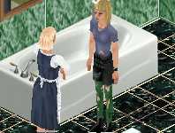 | Well, as you can imagine, this stud was getting pretty frustrated. So, when the 'plate on the floor' plan to get a free look up the maid's skirt didn't result in something a little more exciting (damn, if only she wasn't trained how to properly bend her knees to pick some thing up), Dirk cooks up another plan. "Ahem, excuse me Mimi...when you're done with the dishes, I need your help with something in the bathroom." "Oui, monsieur." |