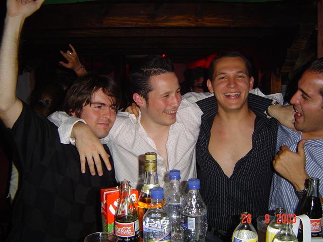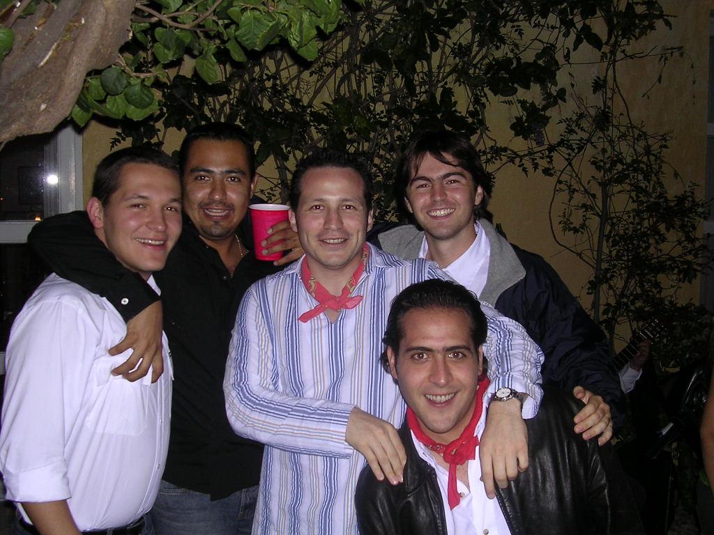 ahora, como las reglas del juego cambian, la modalidad de la pamplo '03 fue 2x1 en novias, bebidas y tamales goajaqueños (estaban excelentes) y así cada quien llegó con su cual, juntos, pero no en omelett! el único que llegó sólo con la mitad de si mismo fue el hilmar (según el había estado "estudiando" incansablemente durante 43 hrs seguidas), pero un vez que fluyo el vino, cerba, güiski o bailisñac... al diablo con los toros y toreados y se dedicaron a hacer lo que mejor saben hacer: plantarse como macetas mientras ingestaban botana y lots & lots of alcochol! en fin todo estaba listo... y ni gurru (el ligue de pepe) ni "el oigame no" ni el botija militar ni fernandito podrían detener la feda!
