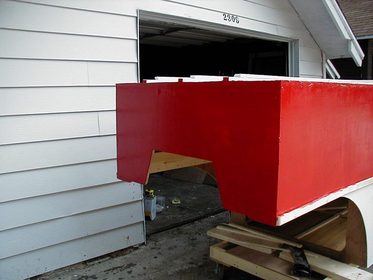 Been doing some painting/sealing. The red paint is oil based and the white is latex. We'll see which is better. I sealed all the screws and joints with silicone caulk, to which the oil based paint stuck, but the water based latex didn't.