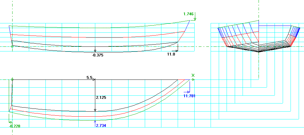 Corazone is designed to be a possible rower but more of a sailer. It is a little more complicated to build than a 1 chine boat but has a definite elegance about it. What kind of rigging you will want to use is up to you, as are the seating arrangements. Waterlines are at 300lbs and 500lbs gross weight. The boat should run in the 90-110lb range, using stitch and glue and 1/4" ply.