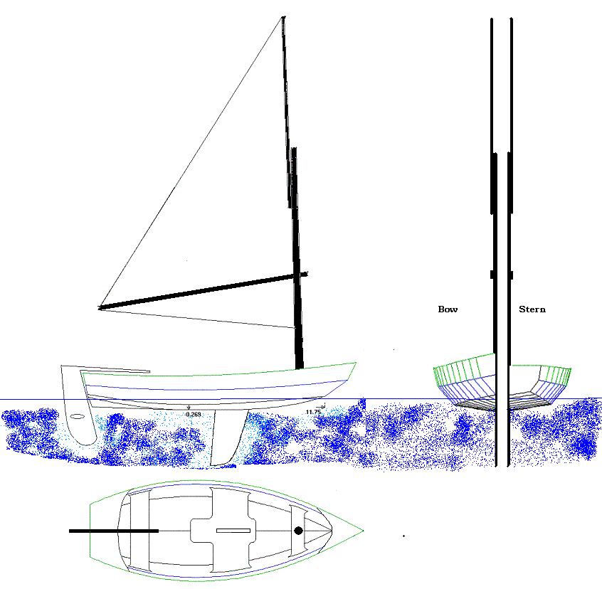 Zephyr is a 13.5 foot (4.1m) Multichined Vee bottom sailing/rowing boat. Beam is 4.5 ft and it uses a weighted daggerboard for stability. The rig shown is a sliding gunter with a sprit boom and is as efficient as a bermuda rig with the associated spars being significantly shorter and more easily stowed. The bottom has a mild Vee, for good initial stability and decent waterflow characteristics. It will also be a nice rower for one or two persons, with a small skeg for directional stability and a nice broad rowing seat. Of course, the builder will be able to arrange the interior seating as needed.