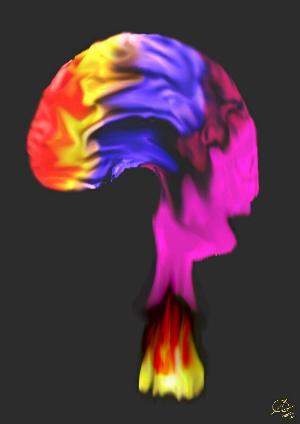 Thinking about the way the he described his experiences with certain stimuli I was inspired to paint a piece which could most simply be described as an inverted brain shaped silhouette of a rainbow with a bright white tablet at the base of the brain stem.