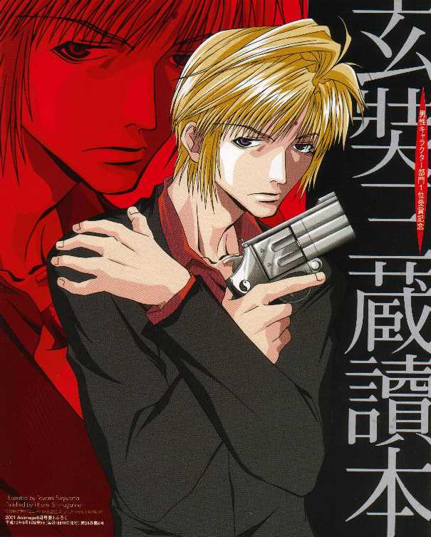 Also from GENSOMADEN SAIYUKI. Sanzo is a bad example for a monk...well, he's a monk...but he drinks Sake and smokes a lot...he's totaly different from Hakkai. He's so cold, un-friendly, but he's the leader of the gang (Hakkai, Gojyo, Goku). In his previous life, he lived as a God as well, named Konzen.