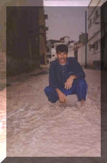 وهذا الشاب يتوسط سيل ماء المطر الذي قدم من جهة الجبل الذي ساعد على انسيابه انحدار سطح الأرض