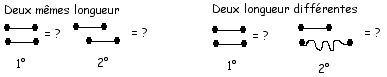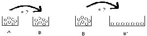 -> Rappelons que le schémas traditionnel des expériences classiques de conservation est le suivant: on présente à l’enfant deux objets - A et B - équivalents soit au point de vue du poids, soit de la longueur, soit du nombre, etc. L’enfant reconnaît cette égalité. L’objet B est ensuite transformé en B’ (changement de forme, déplacement, transvasement en des récipients de différentes dimensions, etc.). L’enfant doit alors déterminer la relation existant entre A et B’ ( =, différent, plus léger, moins long, plus nombreux, etc.)
