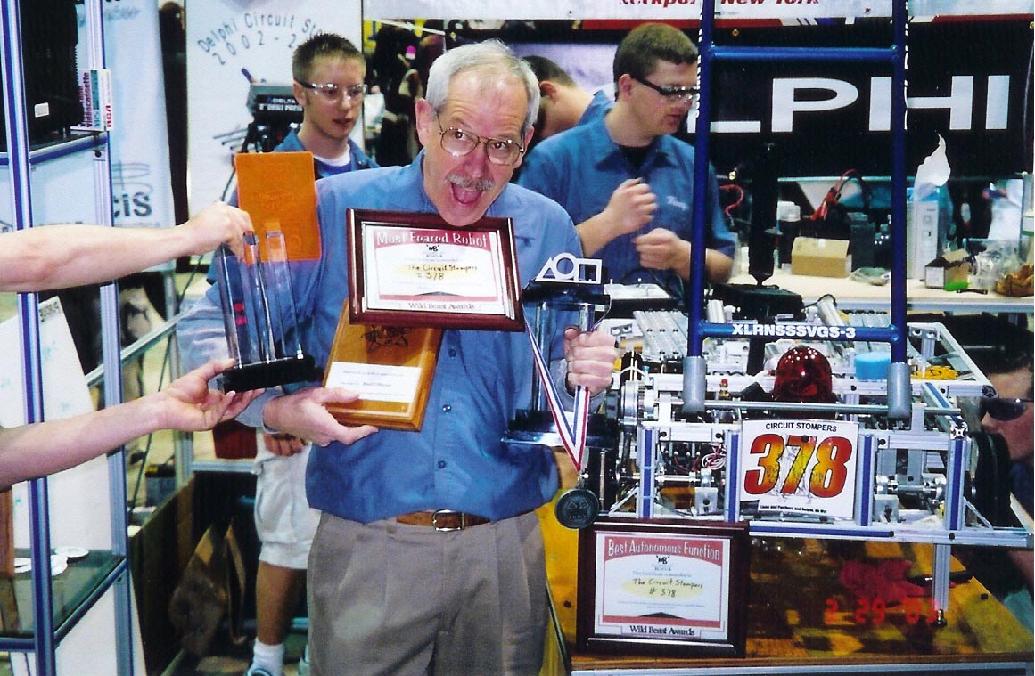 WITH A STRONG SHOWING, THE 2003 DELPHI CIRCUIT STOMPERS AND THEIR "FLYING MONKEY" ROBOT WERE ABLE TO TAKE HOME THE GOLD IN THE NEWTON DIVISION. COACH FIEGL PLAYED NO SMALL ROLE IN THE TEAMS SUCCESS.