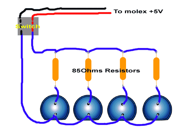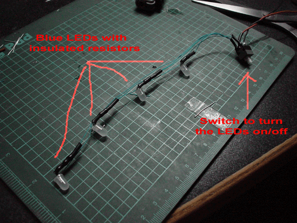 Note: remember to solder a resistor to each LED to limit the current. I have added a switch to my circuit this is to let me turn on/off my glowpad in the case that i need to leave my computer overnight. *i can't sleep with bright blue LEDs!* hehe