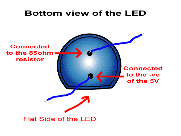 Show on the left is a bottom view of the LED, notice there is a flatside if you see it from the bottom. Connect the pin closest to the flatside to the negative. As for the other pin, it is to be connected to the 85Ohms resistor.