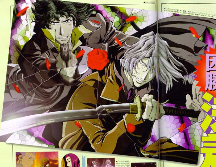 Vicous is beyond COOL. he is even cooler then Sepferoth (FF7). He has purple hair to his shoulders, he carries a sword with him and uses it as his weapon of choice, he carries a black bird with a long neck on his shoulders and is just realy ... well COOL. watch Cowboy Bebop to see what i mean.