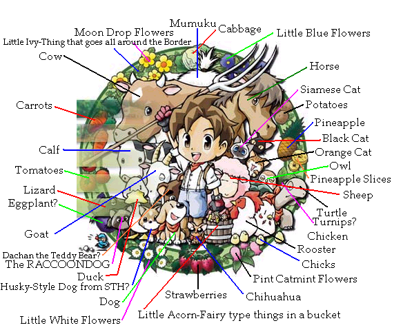 Here's everything diagramed and pointed out for you. I decided agains pointing out the obvious, such as the bustling Blue Harvest Sprite and yourself. Might take a minute to load...
