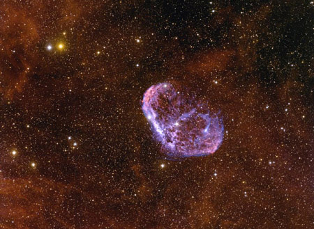like an emerging space cocoon, the Crescent Nebula, also known as NGC 6888, lies about 4,700 light-years away in the constellation of Cygnus.. A leading progenitor hypothesis has the Crescent Nebula beginning to form about 250,000 years ago.
