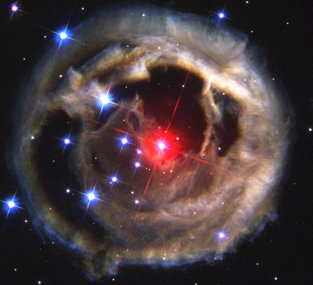 V838 Mon lies about 20,000 light years away toward the constellation of Monoceros, while the largest light echo above spans about six light years in diameter.