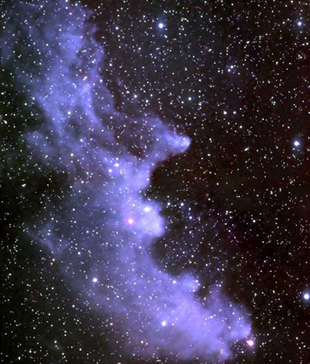 Double, double toil and trouble; Fire burn, and cauldron bubble -- maybe Macbeth should have consulted the Witch Head Nebula, the suggestively shaped reflection nebula. The blue color is caused not only by Rigel's blue color but because the dust grains reflect blue light more efficiently than red. The same physical process causes Earth's daytime sky to appear blue, although the scatterers in Earth's atmosphere are molecules of nitrogen and oxygen. The nebula lies about 1000 light-years away.