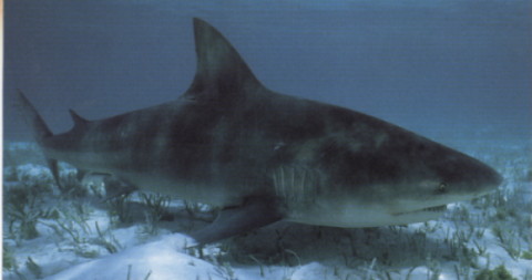 The Bull Shark is the largest & most dangerous of all requiem sharks. Although it is almost half the size of the Great White Shark. The bull shark is a scavenger it will eat almost any marine animal that it can capture. Including, smaller requiem sharks, sea birds, turtles, dolphins, fish, bottom dwellers (like lobsters), squid, & in some cases, trash. Bull sharks have almost the same diet as tiger sharks. This shark can tolerate fresh water & salt water. The Bull Shark is stout & is colored gray/black/brown. It is capable of bursts of speed to catch fast moving prey. It is considered dangerous. Sadly, it is vulnerable to fisherys.