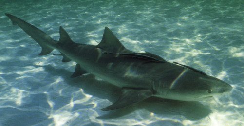 The Tiger Shark is named after the spotted stripes on it's back. The stripes on the tiger sharks back are mostly seen in smaller young sharks. As they get older the stripes fade. Like the Bull Shark, the Tiger Shark is one of the largest & most dangerous requiem sharks. It will eat almost anything it can catch. (Very rairly people!) It preys on things such as: smaller requiem sharks, sea birds, turtles (It's favorite!), dolphins, fish, bottom dwellers (like lobsters), squid, & in some cases, trash. this shark is very rarely seen, but can be found in tropical waters.