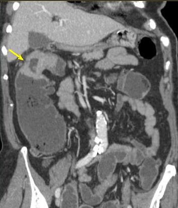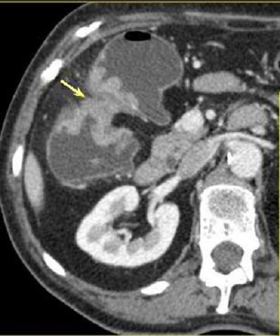 fleche rouge ) . Colos scanner a eau en coupe axiale