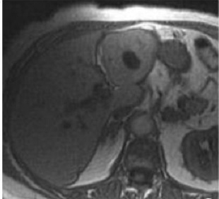 T1 + gadolium FS : Image ovalaire a hypodense du foie