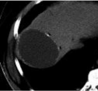en coupe axiale d'une kyste simple du foie gauche ,avec