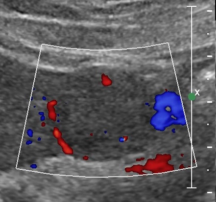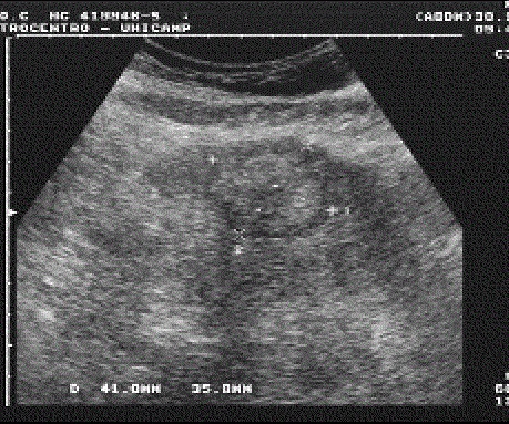 est une masse hyperechogene , hypoechogene ou mixte , unique