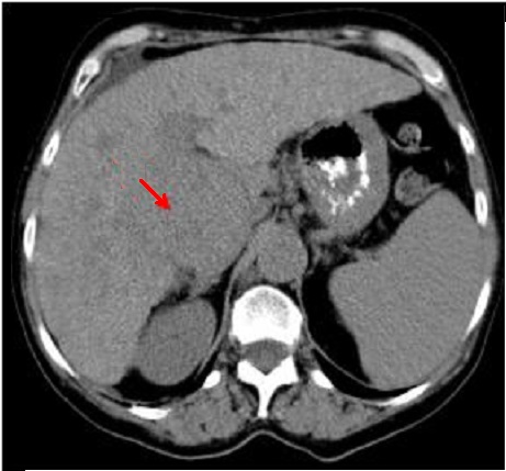 hepatocarcinoma du foie droit . Aspect hypodense du