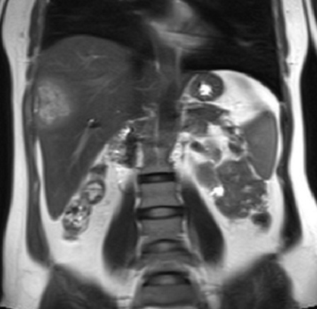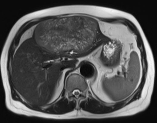 cirrhose et ascite . Image IRM en T2 |