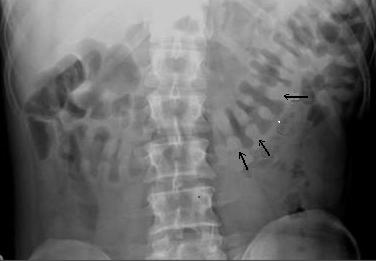 tres grave par la presence des eruptions de la muqueuse du colon ( fleche noire ) . |
