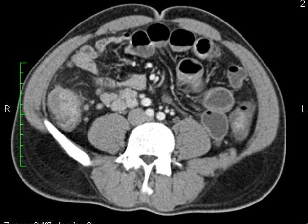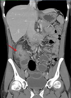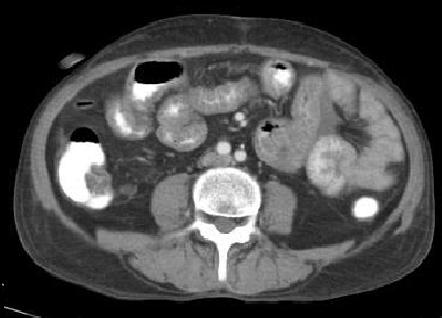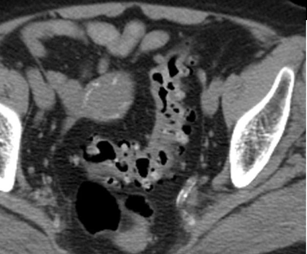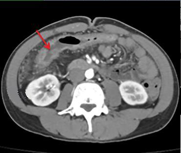 ileo-caecale( fleche rouge ) Image TDM en coupe axiale |