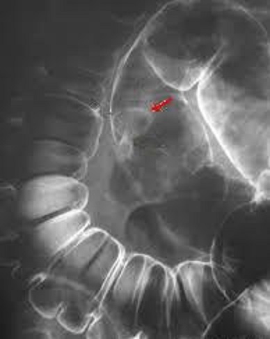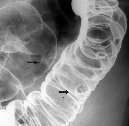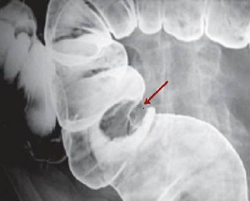 fleche rouge ) . Image radiologique de lavement