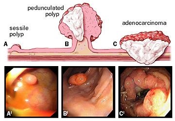 hyperplasique a sessile du colon (A') , polyp pediculaire ( B') et adenocarcinoma du colon (