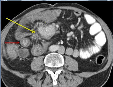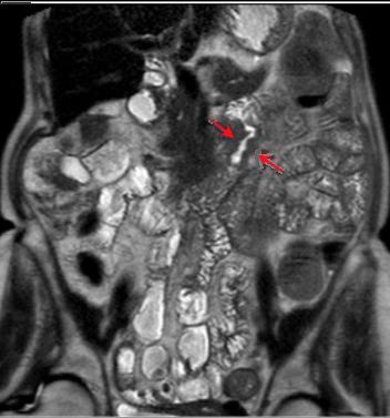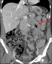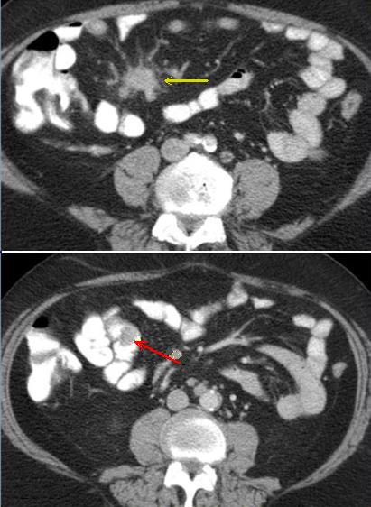 d'une masse spicule ( fleche jaune ) mesenterique ( reaction