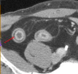 paroi. Maladie de Crohn de ileon en coupe TDM axiale