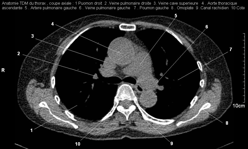 Radioanatomie pulmonaire ( image radiologie thoracique normale )- La Tomodensitometrie du  thorax ( coupes axiales fenetre mediastinale )