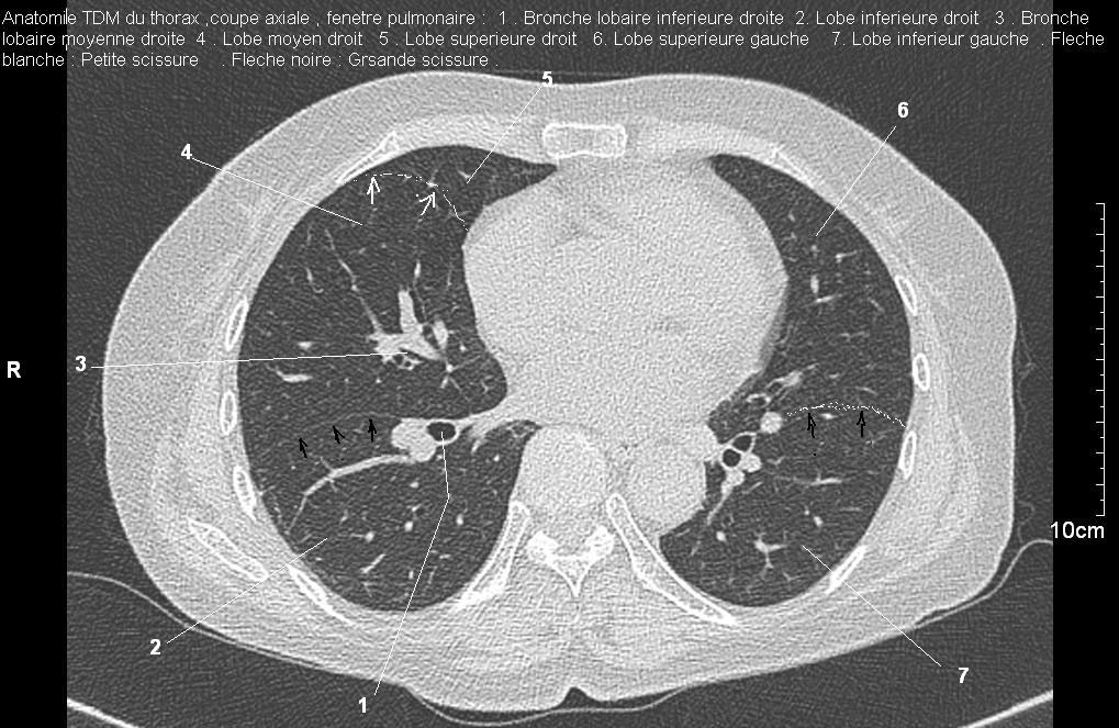 Radioanatomie pulmonaire ( image radiologie thoracique normale )- La Tomodensitometrie du  thorax ( coupes axiales fenetre pulmonaire )