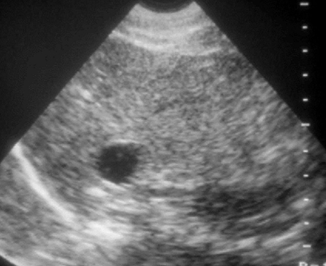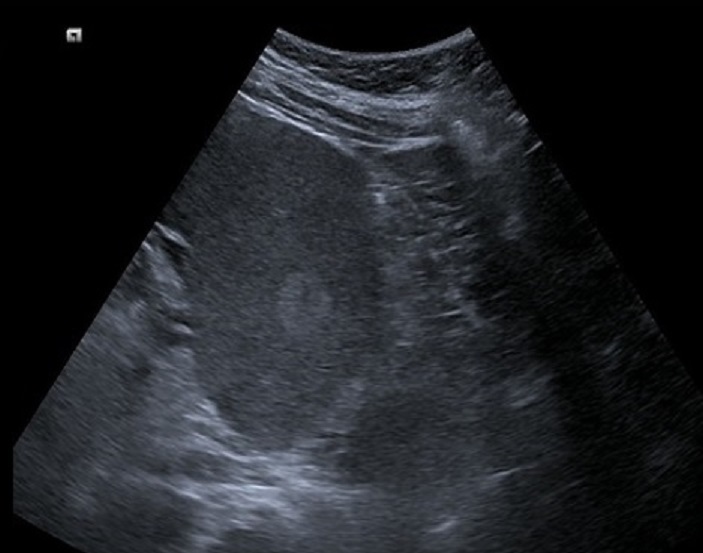 masse arrondie, hétérogène, hyperéchogène avec lacule