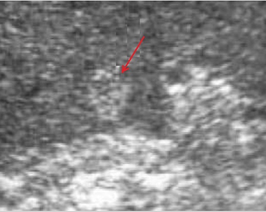 nodulaire hyperechogene , heterogene ( fleche rouge
