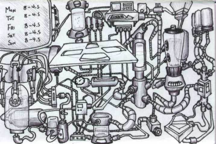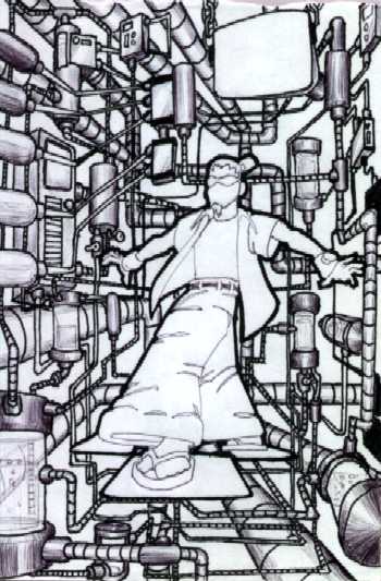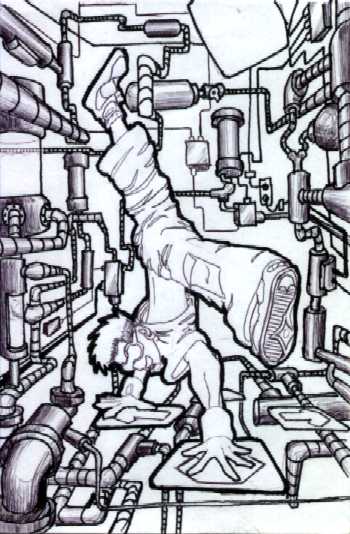 Unlike most previous "pipes" pictures, this one shows my first real foray into the 3rd dimension. Previous "pipes" pictures had been flat, with the actual piping not straying very far up into the foreground or back, if it did at all. However, it does still remain "in-bounds", not breaking the barrier of the edge of the page.